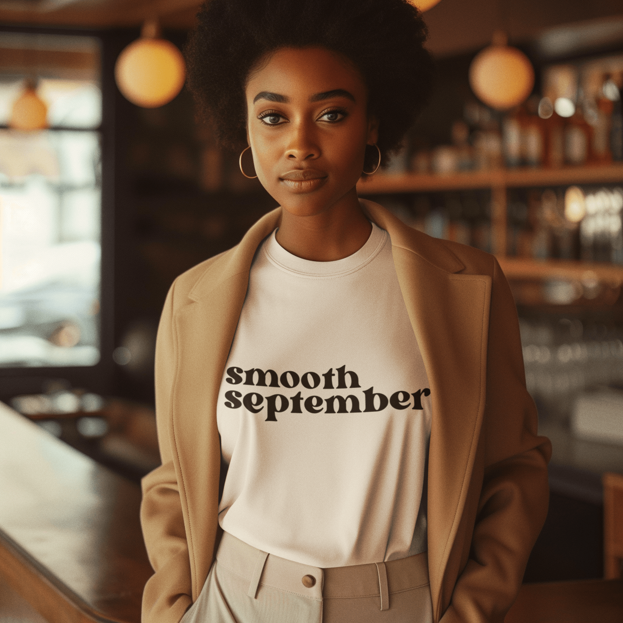 • Smooth September soursop leaf and ginger root herbal tea in biodegradable tea sachet bags, displayed inside a 16oz resealable pouch beside a tea mug.